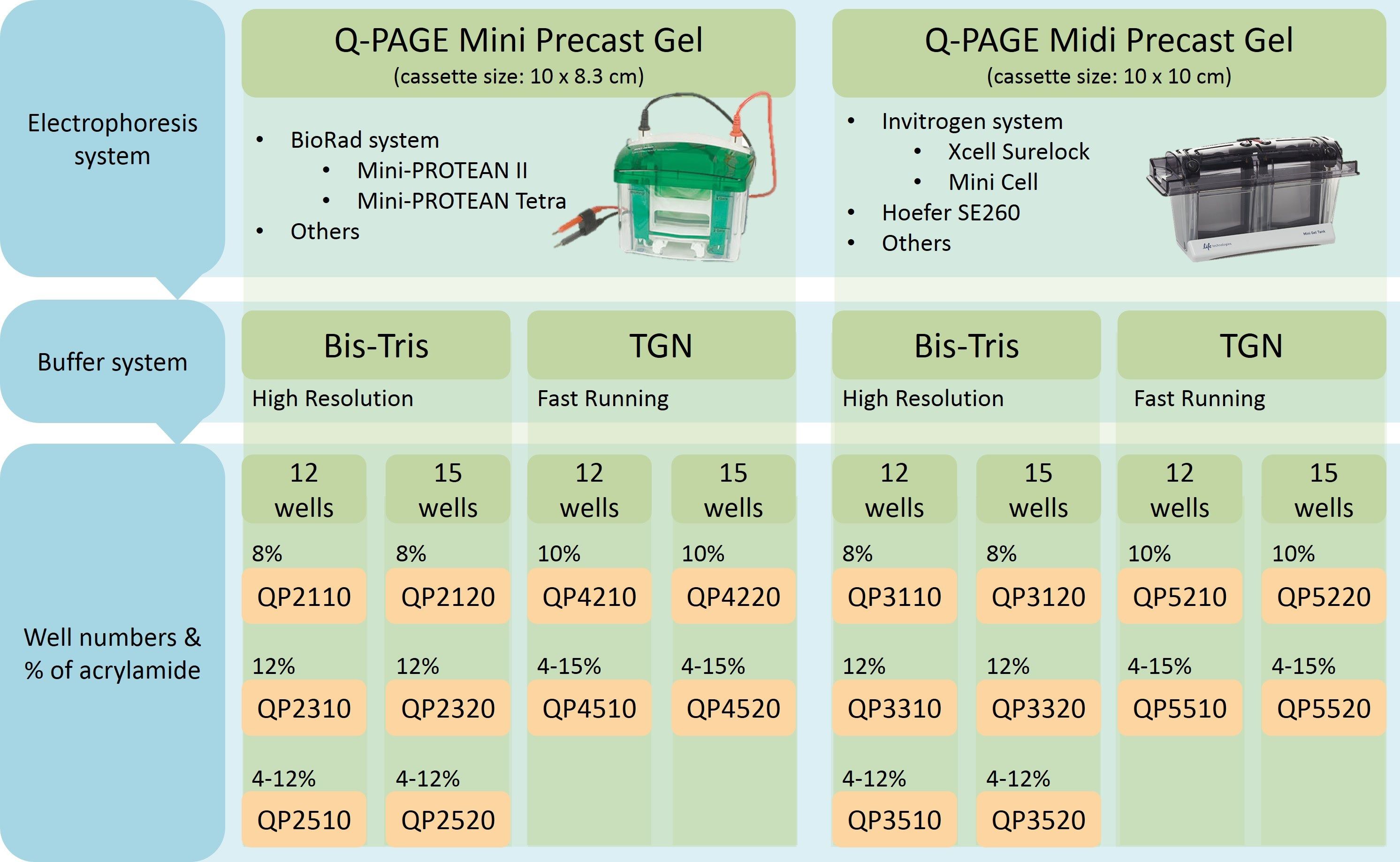 Q-PAGE™ Midi Gels (10 x 10 cm) are suitable for Invitrogen® XCell SureLock® Mini-Cell, Hoefer SE260, and other systems.