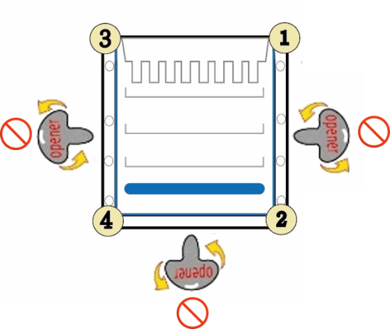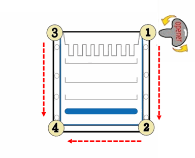 2. To correctly open the cassette, separate each of the three bonded sides of the cassette by inserting the cassette opener into the gap between the two plastic plates from the corner and twisting carefully. Start opening from the corner at the top, and move along each side of the cassette. For example: Start moving from corner ① to ②, moving from corner ③ to ④, and then moving from ② to ④.