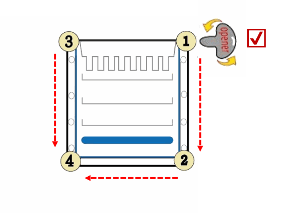 1. Separate each of the three bonded sides of the cassette by inserting the cassette opener into the gap between the two plastic plates and twisting carefully. Start from the corner at the top, and move along each side of the cassette. For example: Start moving from corner ① to ②, moving from corner ③ to ④, and then moving from corner ② to ④.