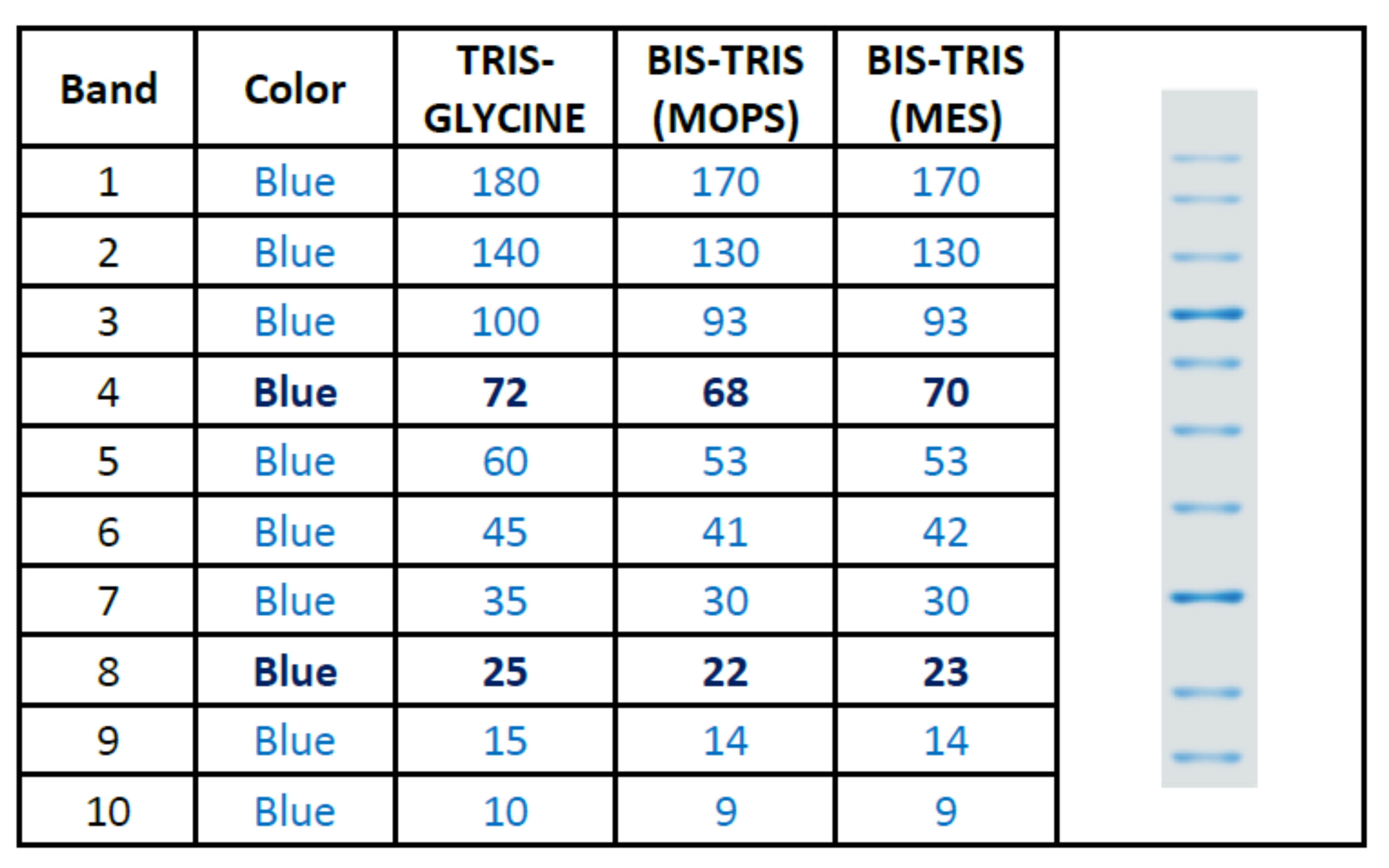 Under suggested conditions, PM1500 ExcelBand™ All Blue Regular Range Protein Marker resolves 10 major bands in SDS-PAGE (Tris-Glycine buffer, MOPS, and MES buffer) and after Western blotting to nitrocellulose membrane.