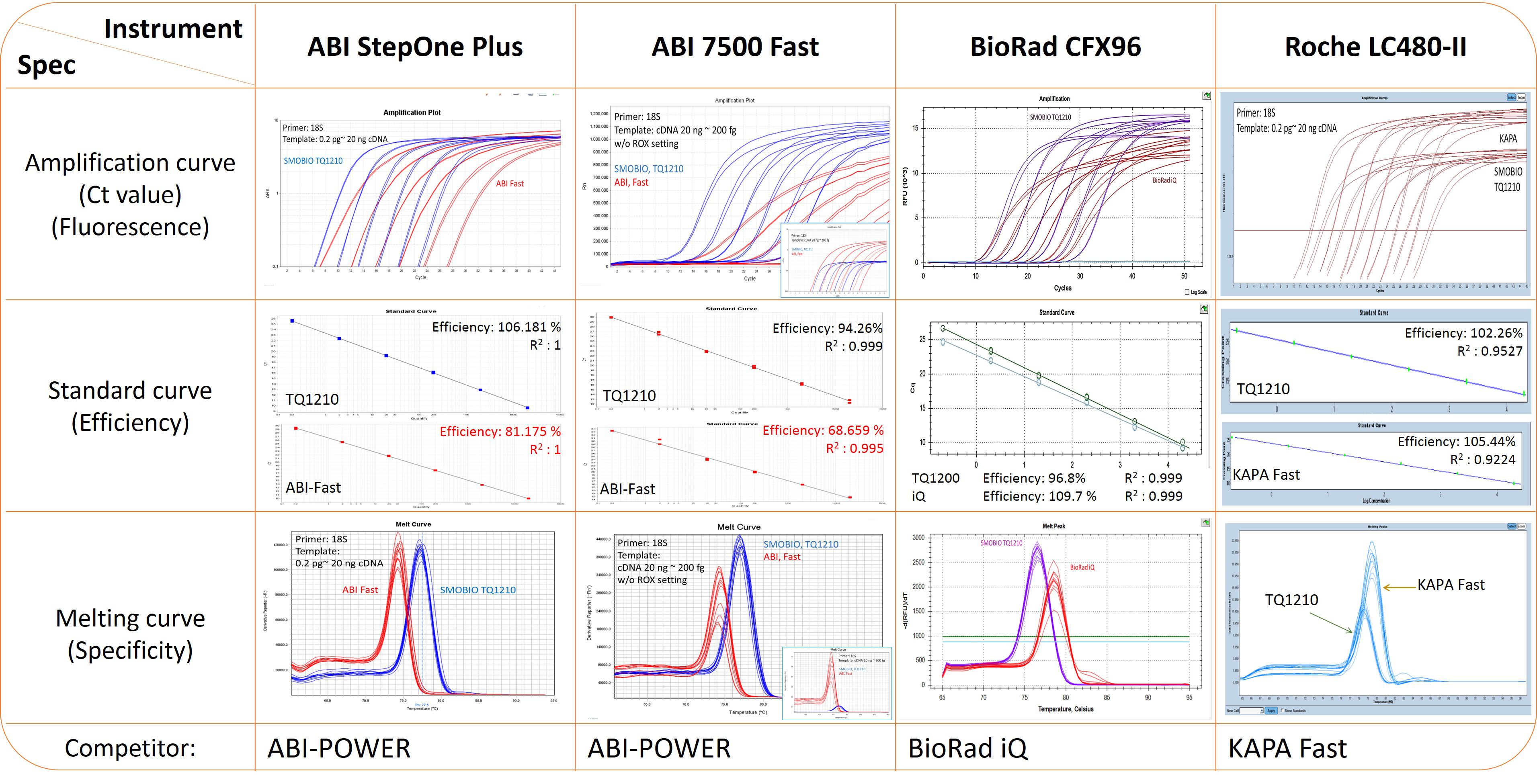 The standard curves were examined using fast program with cDNA ranging from 200 fg to 20 ng as template. The efficiency was calculated according to the slope of standard curve. The efficiency of TQ1210 is approximately 100% showing that TQ1210 is more compatible with fast program as compared to brand A (efficiency: 71.9).